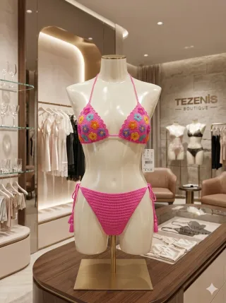 Costume da bagno due pezzi Tezenis con un design floreale colorato e vivace. - Top a triangolo con dettagli floreali. - Slip con laccetti laterali e nappe. - Tessuto lavorato all'uncinetto.