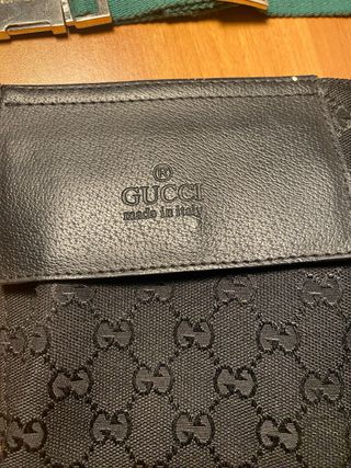 Borsello Gucci . - Tracolla regolabile con nastro a righe rosse e blu. - Tasca esterna con zip. - Logo Gucci in rilievo sulla parte frontale.