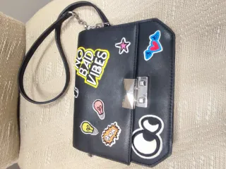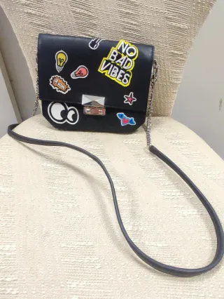 Piccola borsa da donna con un design unico e colorato. - Patch a tema No Bad Vibes. - Patch con cuori alati e stelle. - Patch con lampadine e fumetti. - Chiusura a scatto metallica.