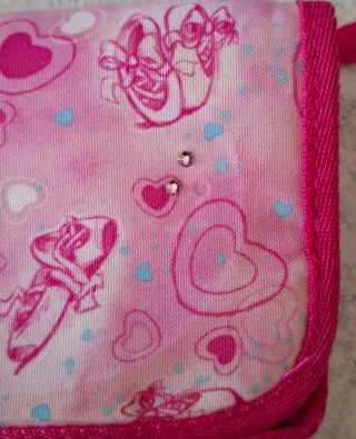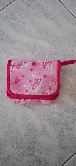 Piccolo portafoglio con fantasia a cuori e ballerine. - Chiusura a patta. - Bordatura in tessuto fucsia. - Piccolo laccetto laterale.
