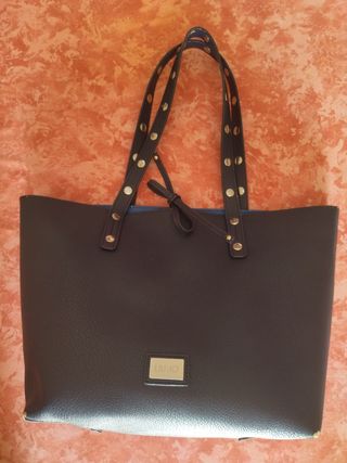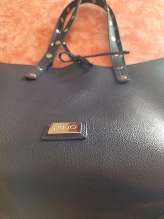 Borsa Liu Jo blu scuro all'esterno e azzurro al suo interno. Manico con borchiette argentate. Laccio per la chiusura della borsa rovinato dall'usura (vedi foto). La borsa seppur nuova risulta rovinata negli angoli e nel bordo superiore a seguito del suo utilizzo (vedi foto)