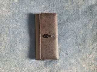 Portafogli argentato con dettaglio fiocco dorato. Mai utilizzato, ancora imballato. Spazioso e capiente, con scomparti laterali per le carte e uno centrale per le monete. Ottima idea regalo
