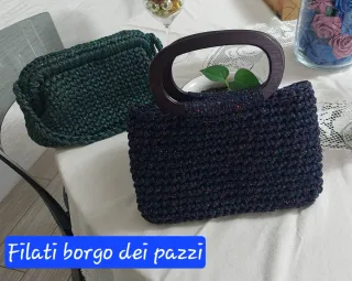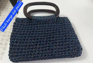 Borsa realizzata all'uncinetto blu con un design unico e manici in legno. - Finitura scintillante. - Manici in legno scuro.