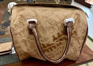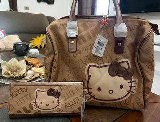 Elegante completo borsa e portafogli donna Hello Kitty. Borsa con manici, molto capiente, con due taschini interni. Chiusura con cerniera. Portafogli modello lungo, molto spazioso, taschino sul retro con chiusura con cerniera. Borsa: 30x28x17 cm. Tutto nuovo, ancora con cartellino (visibili anche i prezzi d’acquisto). Il portafogli presenta una piccola macchia interna, presente già quando acquistato.