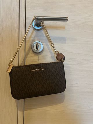 Elegante pochette Michael Kors con il classico monogramma. - Tracolla a catena dorata. - Dettagli in pelle marrone. - Logo Michael Kors in rilievo.