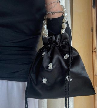 Elegante borsetta a sacchetto modello Halite, realizzata in raso con un delicato motivo floreale. - Manico con perle. - Chiusura a coulisse. - Dettagli floreali applicati.