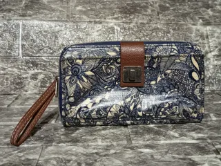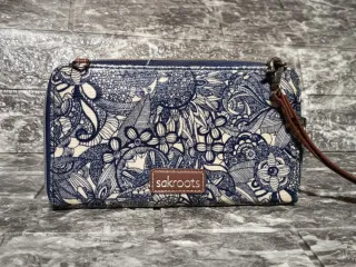 Elegante portafoglio Sakroots con una vivace fantasia floreale. - Chiusura con zip. - Dettaglio in pelle con chiusura a scatto. - Pratico laccetto da polso.