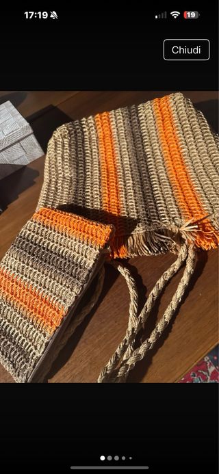 È una borsa lavorato a mano di fettuccia marrone con tracolla e manici in legno abbastanza capiente,nuovo mai utilizzato.