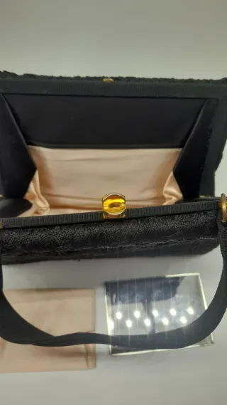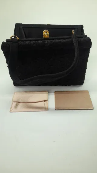 Elegante borsetta da sera vintage, risalente agli anni '50 o '60. Un accessorio raffinato per occasioni speciali. - Tessuto nero con lavorazione floreale. - Chiusura a scatto dorata. - Manico rigido. - Include pochette e specchietto coordinati.