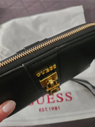 Elegante portafoglio Guess nero, perfetto per organizzare le tue carte e contanti. - Design con zip per una chiusura sicura. - Dettagli dorati con logo Guess. - Include un pratico laccetto da polso.