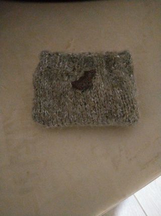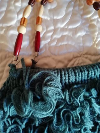 Borsa a uncinetto, colore marrone, con manico in legno, chiusa con bottone a calamita, taschino interno. Interno color beige.