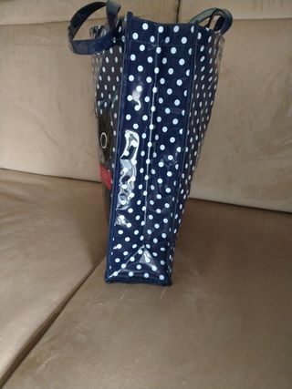 Borsa grande donna in plastica, sfondo blu a pois bianchi. Disegni di gatti sulla parte anteriore. Taschino interno colore beige
