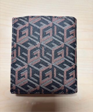 Elegante portafoglio Guess con una distintiva fantasia geometrica. - Fantasia con cubi stilizzati. - Dettagli in rosa e bianco su fondo scuro. - Logo Guess in rilievo.