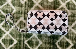 Elegante portafoglio da donna con una fantasia geometrica unica. - Design a scacchiera con motivi a croce. - Chiusura con cerniera. - Include un pratico laccetto da polso.