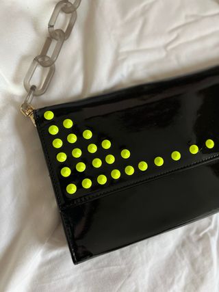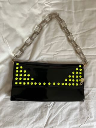 Elegante borsa nera con un design unico e borchie decorative color giallo fluo. Tracolla a catena trasparente e tracolla nera lunga. Chiusura a patta e finitura lucida. Presenta alcune imperfezioni visibili in foto. Dimensioni 29 x 16 cm.