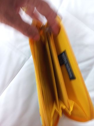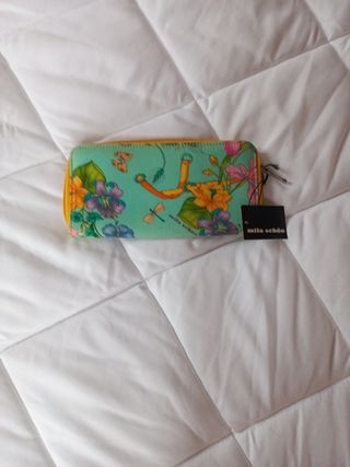 Vendo portafoglio nuovo, mai utilizzato, lungh.20xh.10.Colore azzurro/verde acqua. Leggera piega formatasi sul fondo esterno (vedi foto)marca MILA SCHÖN