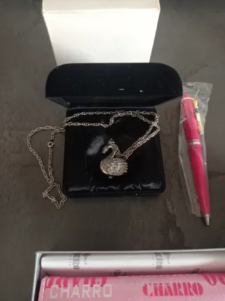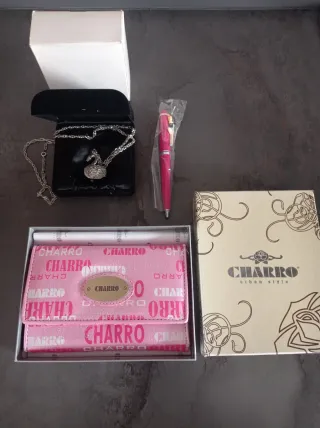 Set regalo Charro composto da portafoglio, collana con ciondolo a cigno e penna. - Portafoglio donna con logo Charro ripetuto. - Collana con ciondolo a forma di cigno. - Penna elegante di colore fucsia. Presenta due imperfezioni come mostrato in foto