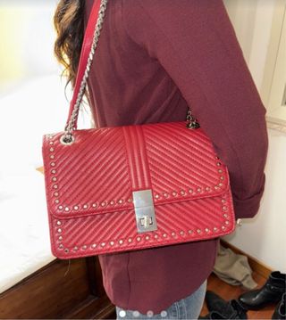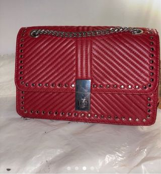 Elegante borsetta rossa con tracolla a catena e dettagli borchiati. Include un portafoglio abbinato. - Design trapuntato a chevron. - Chiusura a scatto metallica. - Tracolla a catena argentata.