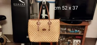 Borsa elegante in pelle e rafia, perfetta per ogni occasione. - Materiale: rafia e pelle - Colore: beige e marrone - interno pari a nuovo - perni in ottone manici davanti da lucidare - misure in foto