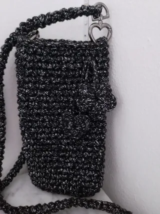Elegante portacellulare realizzato con filo nero e lurex argento, perfetto per portare con te il tuo smartphone. - Design a maglia. - Dettagli scintillanti. - Tracolla intrecciata. - Chiusura con moschettone a forma di cuore. Misura Altezza cm 19 circa Larghezza cm 10 circa Lunghezza tracolla cm 125 circa