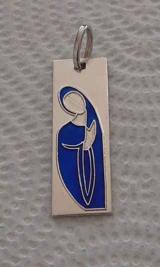 Pendente in argento 925 smaltato, raffigurante la Vergine Maria in stile stilizzato, realizzato da rinomata manifattura vicentina tra gli anni ’70 e ’80. Punzonato e marcato Mod. Dep., sigla che indica “Modello Depositato”, a conferma dell’originalità e della tutela del design presso gli enti competenti. Misura 5 x 1,5 cm e presenta una smaltatura blu profonda che incornicia con eleganza la figura sacra, rappresentata con linee essenziali e grande intensità espressiva. Lo spessore del pendente dona solidità e presenza, mentre il gancio, robusto e ben proporzionato, garantisce una tenuta sicura e duratura. Conservazione eccezionale.