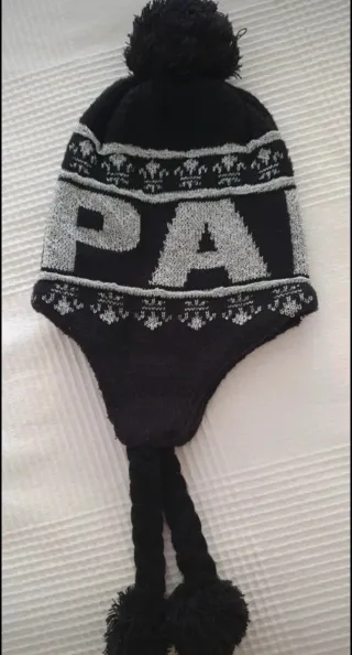 Cappello invernale in acrilico con pompon e paraorecchie. - Design a tema con scritta Paris. - Pompon sulla sommità. - Paraorecchie con trecce e pompon.