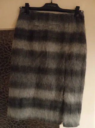 Gonna al ginocchio, a righe grigie e nere. - Tessuto morbido e peloso. - Spacco laterale. 35 cm vita 45 cm fianchi 60 cm lunghezza