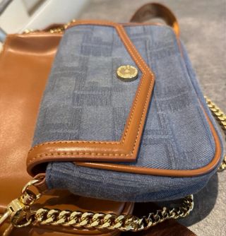 Elegante pochette Elisabetta Franchi, perfetta per ogni occasione. Realizzata in pelle marrone e tessuto blu. - Dettagli in metallo dorato. - Tracolla a catena. - Logo inciso.