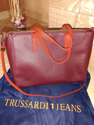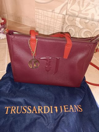 Bellissima borsa a mano Trussardi Jeans originale, capiente ed elegante. Il corpo della borsa è in una raffinata tonalità bordeaux, mentre i manici e i dettagli creano un contrasto moderno in rosso vivace. Dettagli principali: Maxi logo "TJ" in rilievo sul fronte e charm metallico dorato con l'iconico levriero. Chiusura: Zip superiore dorata perfettamente funzionante. Interno: Foderato, molto spazioso, ideale per l'uso quotidiano o per l'ufficio. Accessori inclusi: Fornita con la sua dustbag originale blu con scritte arancioni (visibile in foto). Condizioni: La borsa è in ottime condizioni generali. La struttura è rigida.