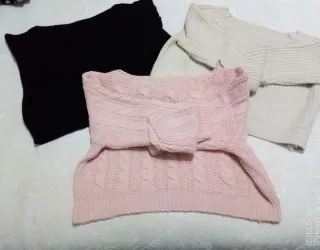 Vendo set composto da 3 maglioni corti in acrilico, morbidi e versatili, perfetti per look casual e femminili. Il lotto comprende tre colori facili da abbinare: nero, crema e rosa cipria. 💎 Dettagli - Modello corto con collo ampio e morbido - Lavorazione a maglia con texture differenti - Il maglione rosa presenta un elegante cable knit - Tessuto morbido, caldo e confortevole - Ideali con jeans o pantaloni La taglia è unica Allego foto con misure Ottime condizioni #lotsdepulls #lotejerseys #setauskurzenpullovern