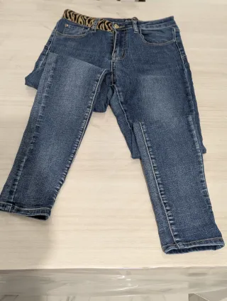 Jeans denim blu Zuiki push up. Il tessuto è incredibilmente elastico e morbido, progettato per abbracciare ed esaltare le curve senza segnare, per valorizzare la silhouette e regalare una forma perfetta. Etichetta taglia 42, ma grazie allo stretch superiore veste anche una 44. L'inserto animalier interno sul davanti e sul retro aggiunge un tocco chic grintoso stupendo! La chiusura è esaltata dall'originale bottone a cuore firmato Zuiki, dettaglio gioiello che lo rende unico. Sono in ottime condizioni generali, segnalo per correttezza delle leggere striature effetto vissuto sulla parte davanti, ma una volta indossati non si nota.