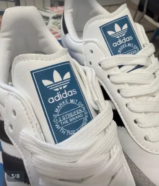Iconiche sneakers Adidas Samba, perfette per un look casual e sportivo. - Tomaia in pelle bianca con dettagli in camoscio grigio. - Strisce Adidas nere sui lati. - Logo SAMBA dorato sul lato. - Suola in gomma marrone.
