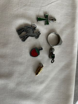 Lotto di ciondoli vintage anni '80 e un anello da collezione. - Ciondolo a forma di ankh con smalto verde. - Ciondolo a forma di animale stilizzato. - Ciondolo a forma di fragola. - Ciondolo a forma di proiettile. - Anello con inserto nero.