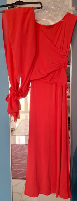 Elegante abito da cerimonia Max & Co. in un vivace color rosso. - Design con scollo a V incrociato. - Dettagli drappeggiati sul fianco. - Senza maniche. - Tessuto fluido e leggero. - Con stola in coordinato