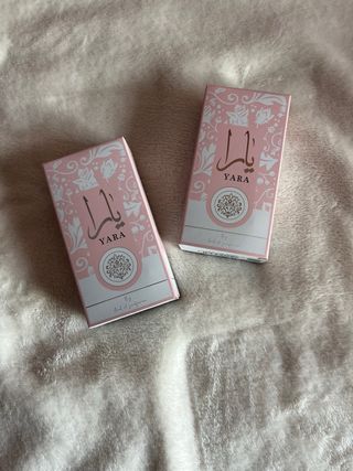 Due profumi Yara Rosa in confezione. Design floreale in toni di rosa e bianco. Ogni confezione contiene un profumo.