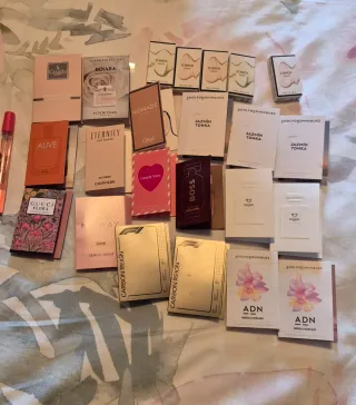 Conjunto di varie campionature di profumi e colonie. Include marchi come Gucci, Calvin Klein e Hugo Boss. Varietà di fragranze e dimensioni.