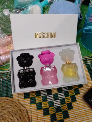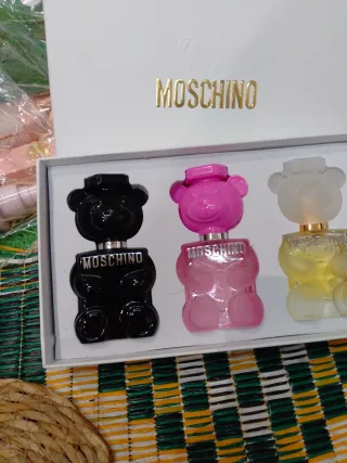 Set di tre fragranze Moschino Toy 2. Include tre profumi. Design orsacchiotto. Colori: nero, rosa e giallo.