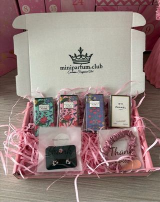 Set di mini profumi di varie marche rinomate, ideale per scoprire nuove fragranze. Include un accessorio. - Mini profumi. - Include un scrunchie e orecchini. - Presentato in scatola regalo.