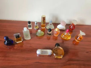Conjunto di miniature di profumi e colonie di diverse marche e fragranze. Ideale per collezionisti o per provare diversi aromi. Bottiglie di vetro con tappi di vari colori e forme. Liquidi di tonalità dorate e trasparenti.