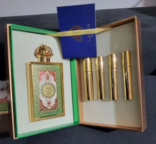 Set di profumi arabi originali del marchio ASQARAT. Presentati in eleganti flaconi e scatole. Flaconi con dettagli dorati e argentati. Scatole di colore rosso e nero.