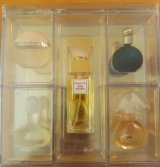 Conjunto di profumi in miniatura di Elizabeth Arden, inclusa la fragranza 5th Avenue. - Flacone di 5th Avenue con tappo dorato. - Include altre miniature di fragranze.