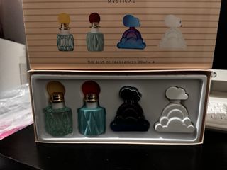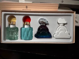 Set di quattro mini profumi del marchio MYSTICAL. Bottiglie di vetro con design unici. Tappi di diversi colori e forme. Include due bottiglie di vetro intagliato nei toni verde e blu. Due bottiglie a forma di nuvola, una trasparente e l'altra bianca.