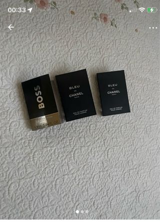 Set di campioncini di profumo da uomo. - 2 campioncini di Bleu de Chanel Eau de Parfum Pour Homme. - 1 campioncino di BOSS. - Dimensioni: 1.2 ml / 0.04 FL. OZ.