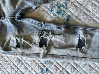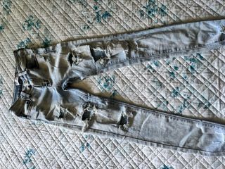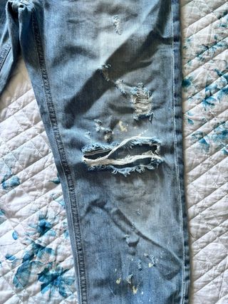 Jeans con strappi, stile trash and luxury, taglia 27. Sono in denim blu e presentano diverse aree con strappi e segni di usura, creando un look unico e particolare. - Taglia: 27 - Lavaggio: Blu - Dettagli: Strappi e segni di usura come nuovo