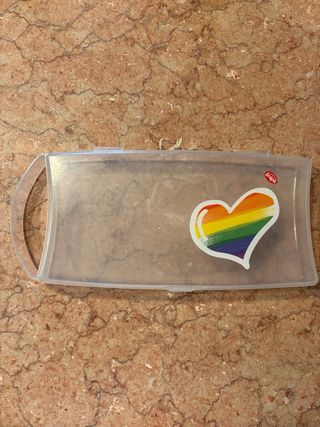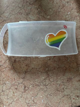 Vendo graziosa scatola portaoggetti del marchio Snipes. E' trasparente e presenta un'immagine di un cuore arcobaleno. Ideale per riporre piccoli oggetti. - Perfetta per organizzare piccoli oggetti. - Realizzata in plastica resistente e leggera. - Design accattivante con un cuore arcobaleno.