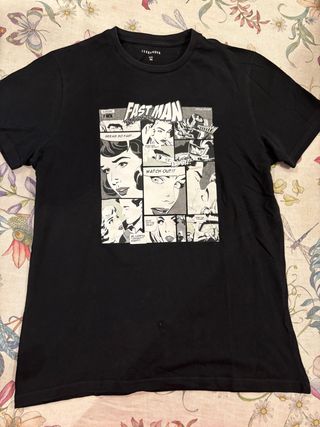 T-shirt nera Terranova, taglia M (38/10). Stampa a fumetti originale. - Perfetta per un look casual.