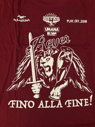 Maglietta celebrativa del Reyer Venezia per i play off del 2018. Presenta una grafica con un leone alato e la scritta Fino alla fine!. - Logo Reyer Venezia sul petto. - Grafica Play Off 2018 sul retro. - Tessuto in cotone.
