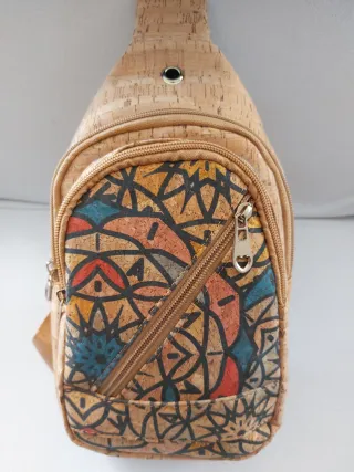 Borsello monospalla realizzato in sughero con una fantasia geometrica colorata. Fatto a mano. - Materiale: sughero. - Design: fantasia geometrica. - Chiusura con zip.