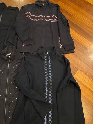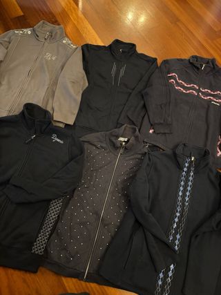 Lotto di sei felpe da donna in taglia XL, perfette per l'inverno. Diverse tonalità di grigio e nero, stato discreto. - Felpa grigia con dettagli ricamati sulle spalle e monogramma. - Felpa nera con zip e decorazione a strisce verticali. - Felpa blu scuro con decorazione a onde rosa. - Felpa nera con zip e scritta Dynamic ricamata. - Felpa nera trapuntata con micro-pois. - Felpa nera con inserto decorativo a rombi.
