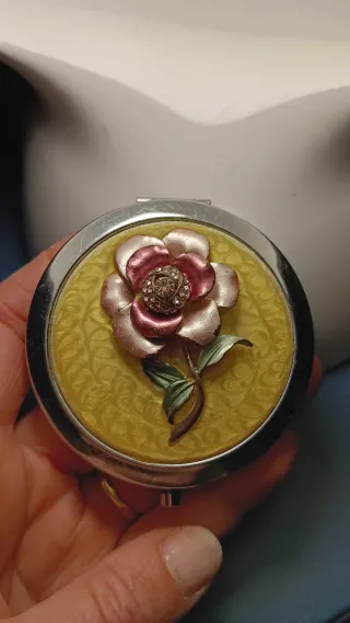 Elegante specchietto da borsa decorato con un fiore tridimensionale e dettagli luminosi. - Finitura in metallo argentato. - Decorazione floreale con petali rosa e centro con brillantini - Sfondo giallo con motivo inciso.